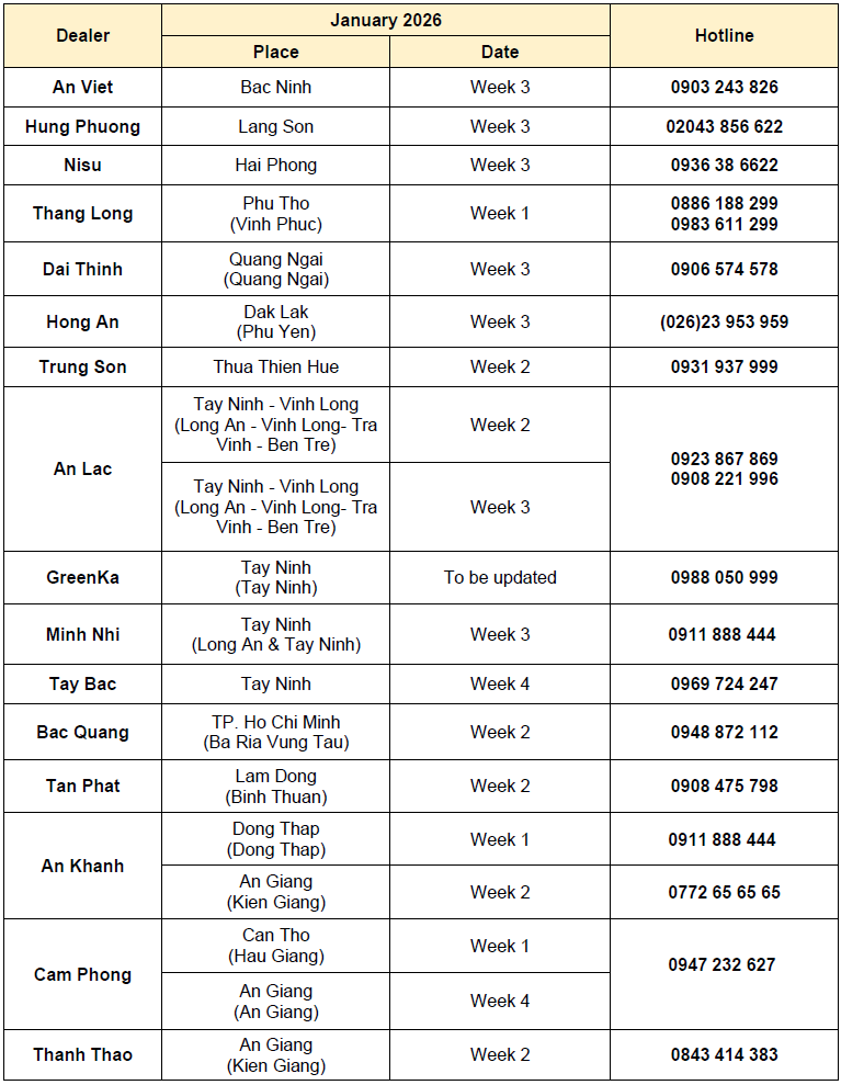 LỊCH BẢO DƯỠNG VÀ SỬA CHỮA LƯU ĐỘNG TẠI HỆ THỐNG ĐẠI LÝ ISUZU THÁNG 1/2026